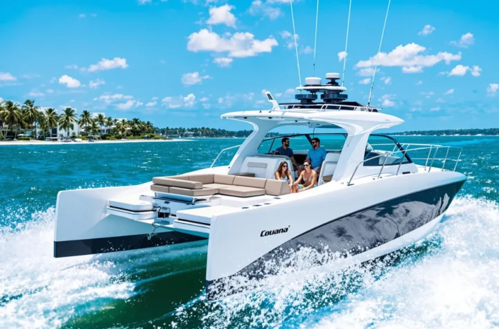 Salt spray stings your face as you throttle up, twin hulls slicing through chop...